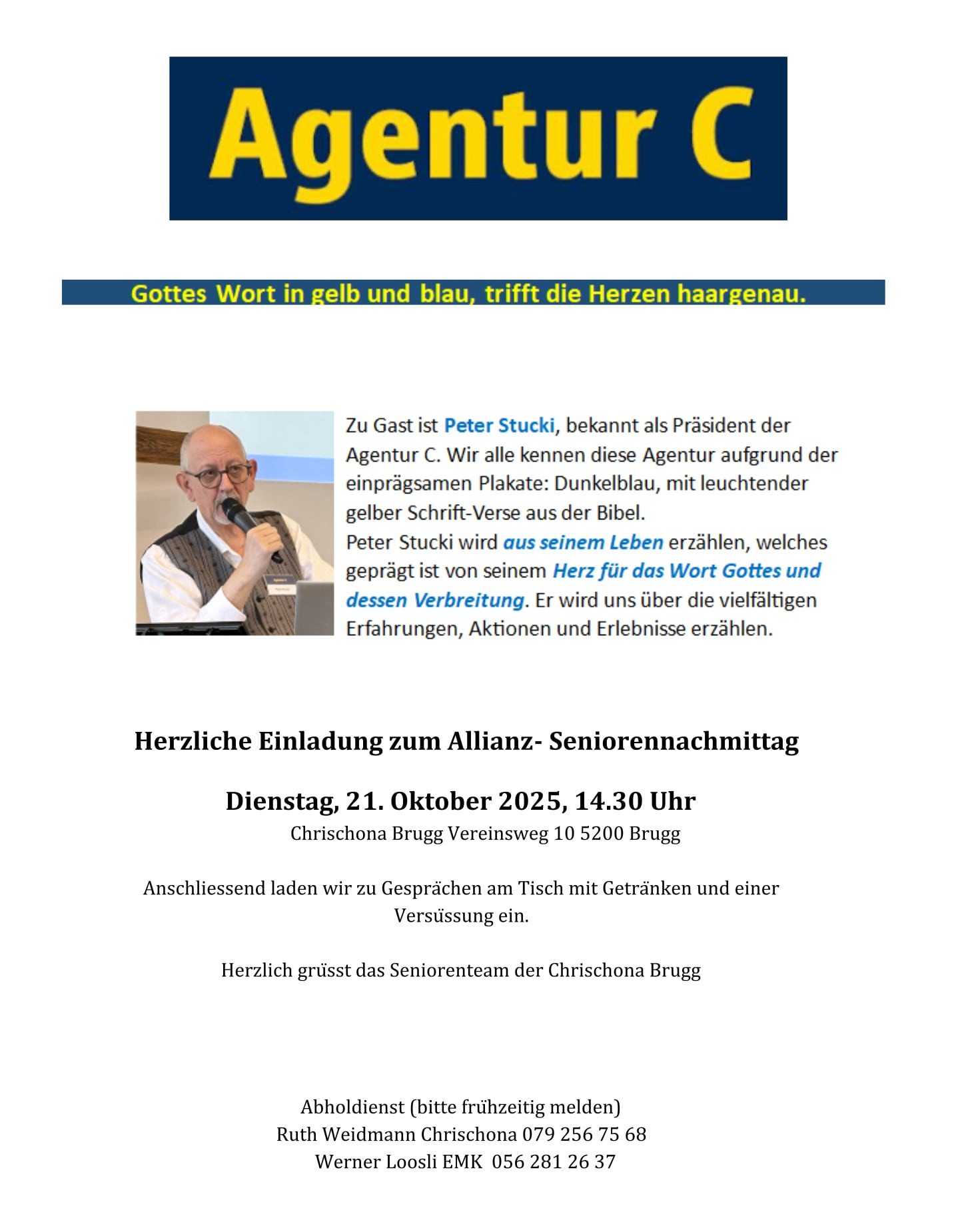 Am Dienstag, 21. Oktober 2025 um 14.30 Uhr ist Peter Stucki, Präsident der Agentur C, bei uns zu Gast. Er wird aus seinem Leben und von der Arbeit der Agentur C erzählen.