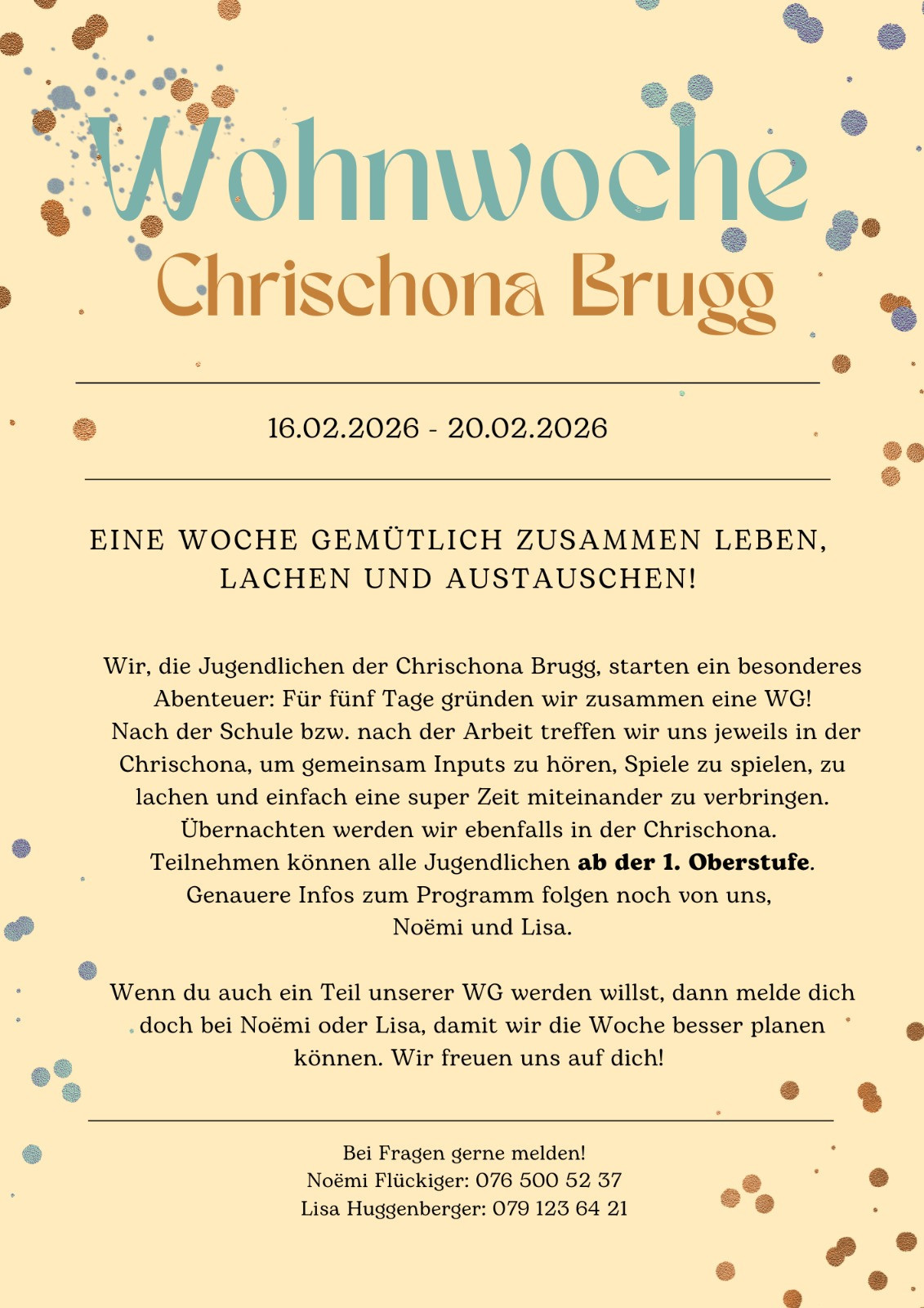 Wenn du auch ein Teil unserer WG werden willst, dann melde dich doch bei Noëmi oder Lisa, damit wir die Woche besser planen können. Wir freuen uns auf dich!