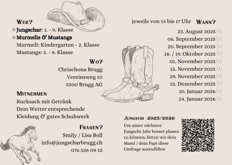 Die Jungschi ist Teil der Jugendarbeit, die zur Chrischona-Gemeinde Brugg gehört. Sie ist dem Bund Evangelischer Schweizer Jungscharen (BESJ) angeschlossen. (Auf diesem Merkblatt erfährst du mehr über den BESJ)