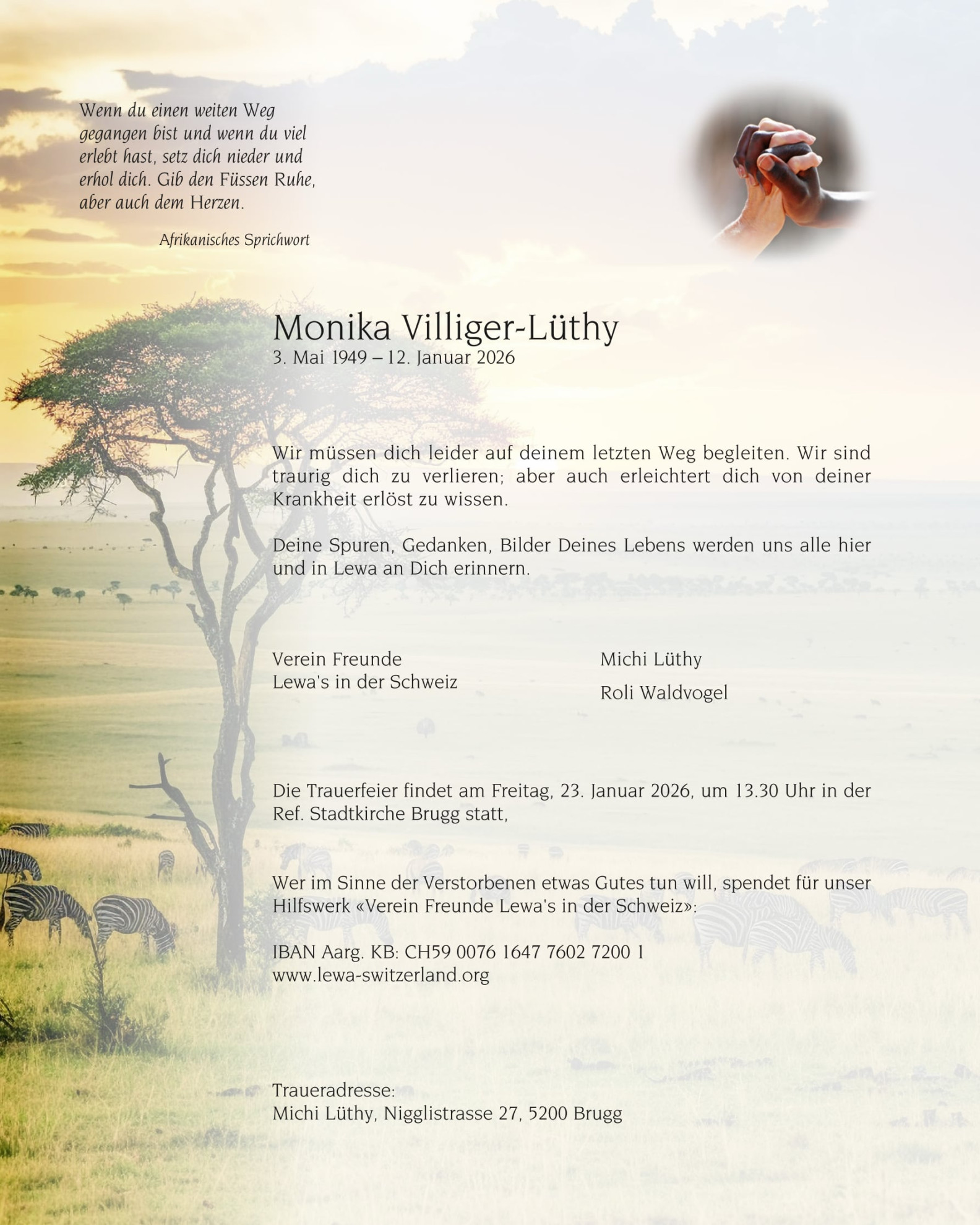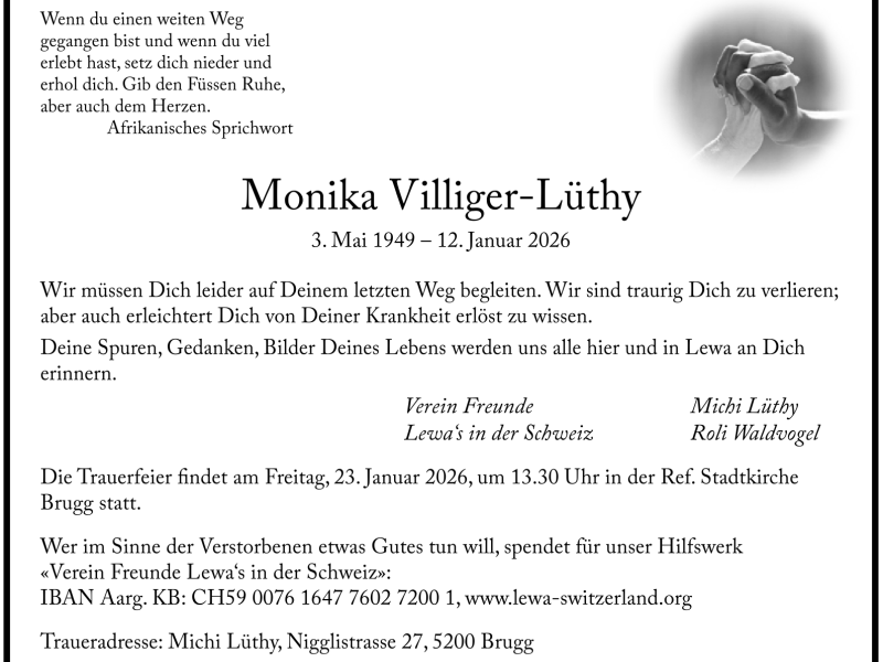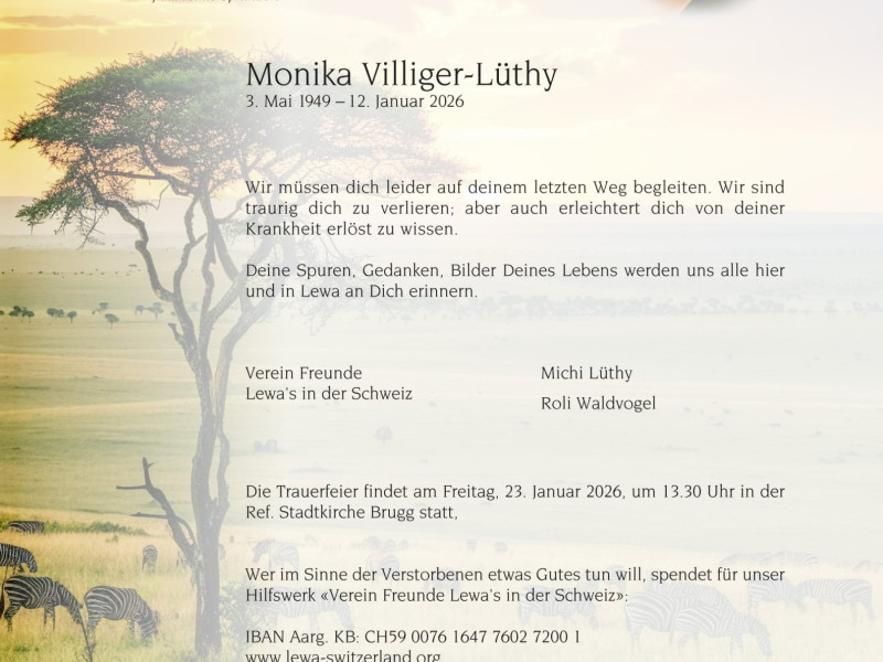 Liebe Gemeinde, in der Nacht von Sonntag auf Montag ist Monika Villiger von uns gegangen. Obwohl Monika uns zwar fehlt, dürfen wir auch dankbar sein, dass sie jetzt von ihrer langen Krankheit erlöst ist und in der Herrlichkeit des Herrn sein darf.