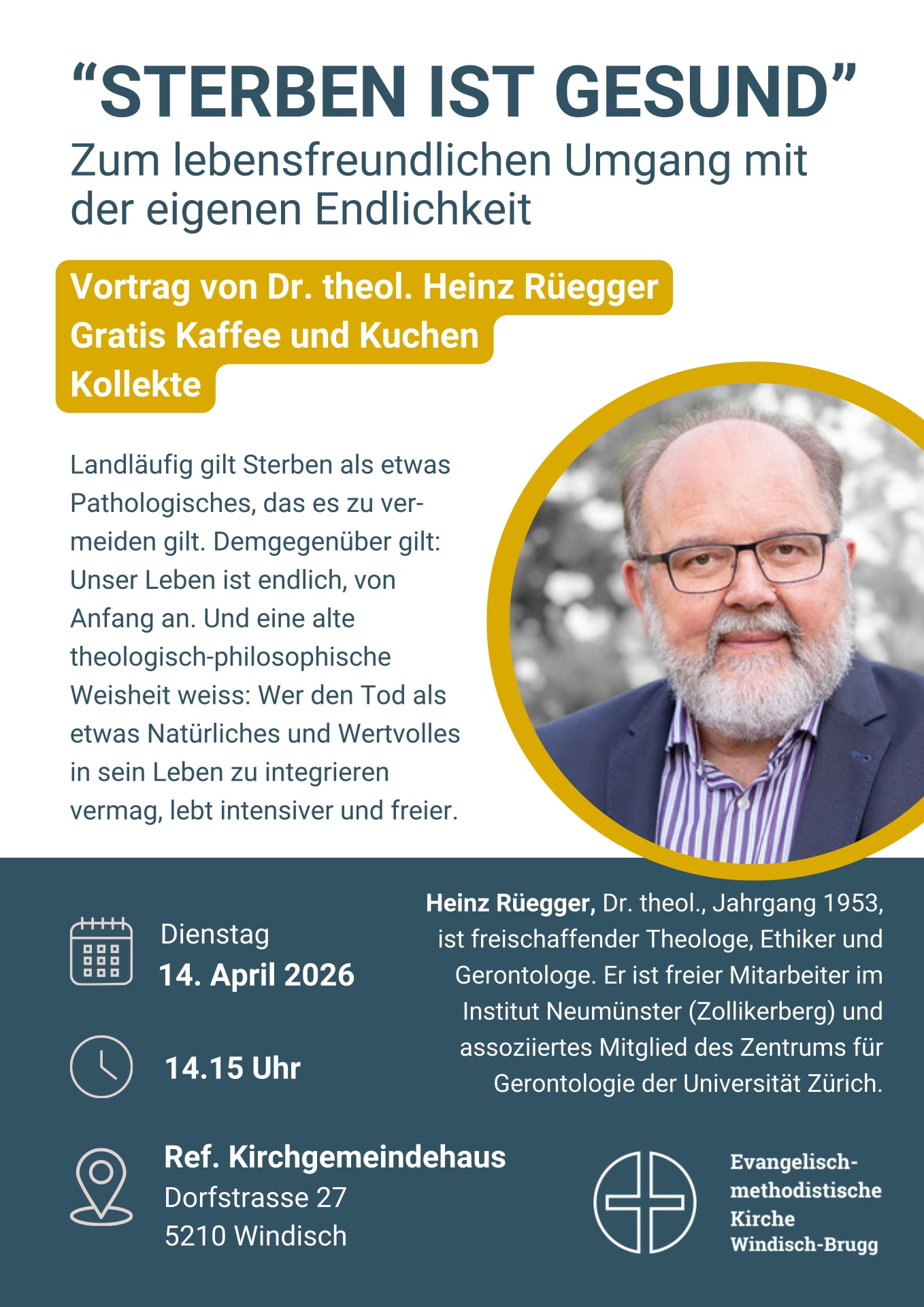 Am 14. April 2026 spricht der Theologe, Ethiker und Gerontologe Dr. Heinz Rüegger im Kirchgemeindehaus Windisch darüber, wie wir zu einem lebensfreundlichen Umgang mit der eigenen Endlichkeit finden. Seine Erfahrung ist: Wer den Tod als etwas Natürliches und Wertvolles in sein Leben zu integrieren vermag, lebt intensiver und freier. Ein sachkundiger Vortrag (nicht nur für Senioren) mit anschl. Kaffee und Kuchen. Herzliche Einladung!